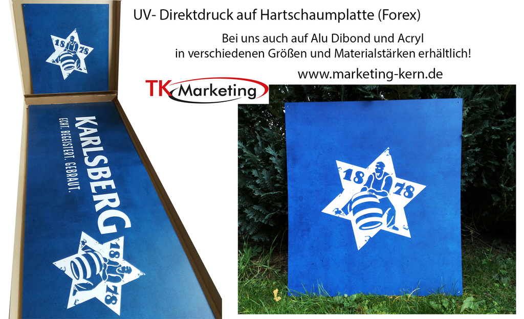 Wir liefern zudem bedruckte Textilien, Alu Dibond,-Acryl oder Hartschaum-Schilder im Direktdruckverfahren oder mit Hochglanz-Monomerfolie beklebt.