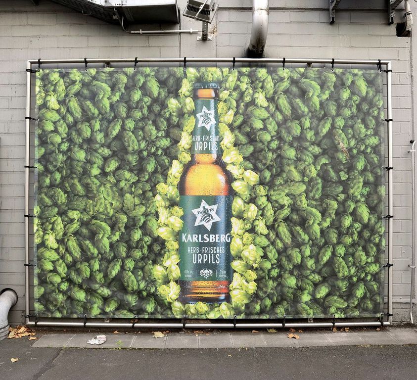 Sowohl als Fassadenwerbung in XXL-Größen auf PVC-Plane, als auch auf winddurchlässiger Gewebeplane (Mesh) für Baunzaun-Gerüstbau-oder Bühnenbanner, auf Fahnenstoff und Künstlerleinwand oder sonstiger geeigneter Materialien.